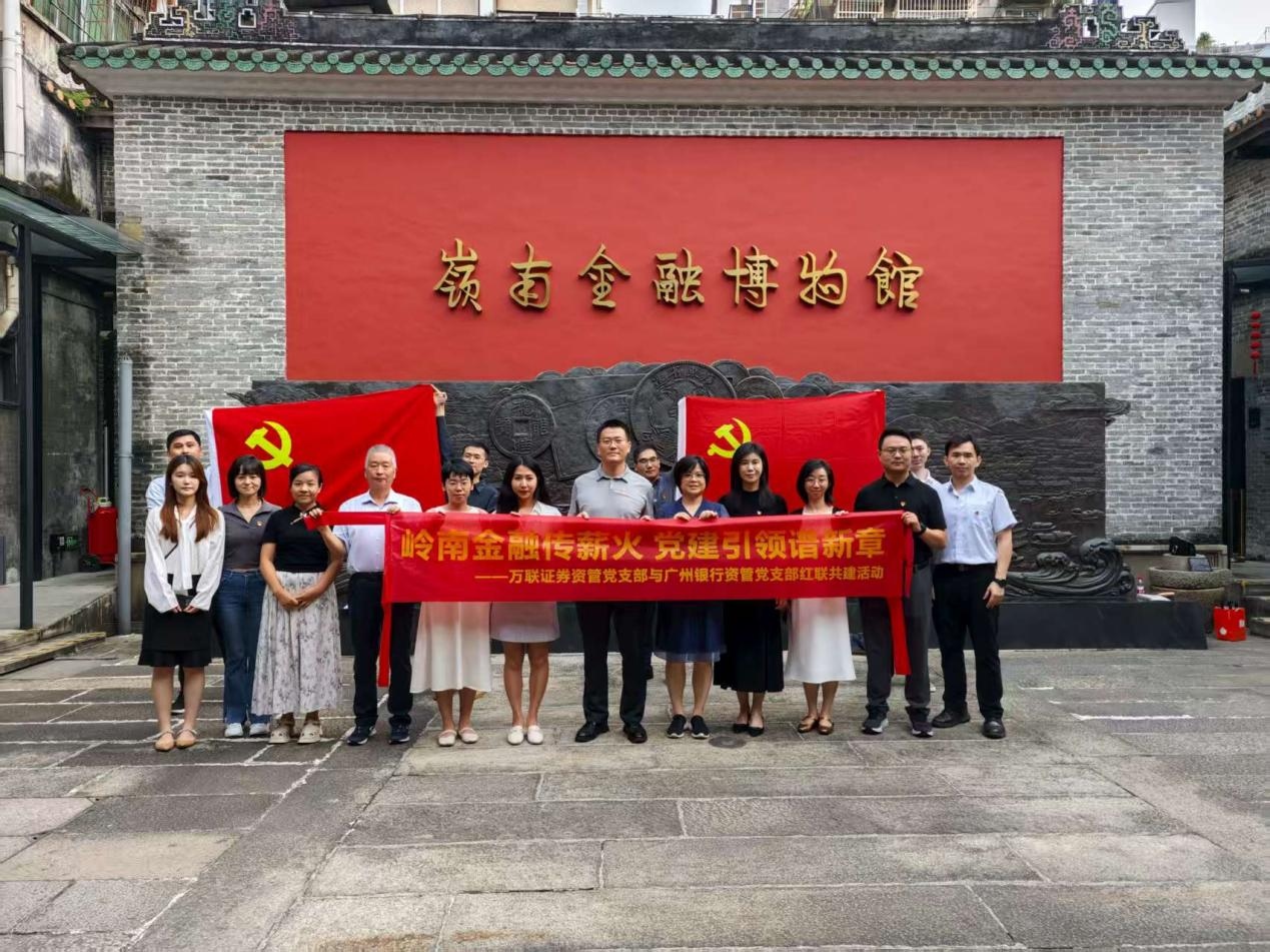 为深入学习贯彻习近平新时代中国特色社会主义思想,落实新时代党建要求,8月28日,中共万联证券资产管理(广东)有限公司支部(下称“万联资管党支部”)与广州银行资产管理部党支部(下称“广银资管党支部”)以“岭南金融传薪火,党建引领谱新章”为主题,在岭南金融博物馆联合开展党建红联共建活动。双方支部共计17名党员共同追寻岭南金融的红色足迹,携手擘画银证资管高质量发展新蓝图。