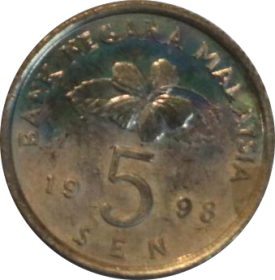 5仙硬币上展示的马来西亚传统陀螺,是马来西亚最具代表性的传统游戏之一。在马来西亚吉兰丹一带,陀螺游戏尤为盛行。陀螺多以木材制成,上部为圆柱形,中部为圆锥状,底部则是尖钉。过去的人们常在收割稻田前玩陀螺,在60至80年代物资缺乏时期,马来孩童尤其喜爱这种传统游戏。在吉兰丹州,还有一种特殊的“锡陀螺赛”。