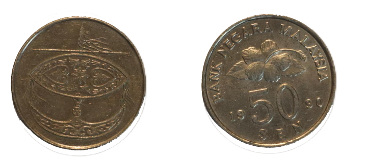 50仙硬币上展示的是马来西亚传统月亮风筝,之所以称为“月亮风筝”,是因为风筝的尾巴呈月牙形状。月亮风筝比其他传统风筝要大得多,典型的大小是2.5米宽和3.5米高,而一般的传统风筝大小在一米到二米之间。月亮风筝以其精致的制作、华丽的花卉和树叶设计以及鲜艳明亮的色彩而闻名。风筝的制作相当讲究,必须挑选面向东方生长的竹子,据说这能保证太阳神始终附在风筝上伴随玩家度一生。在古代,风筝被用于传递信息、驱赶鸟类、保护庄稼等。如今,风筝更多地出现在节日庆典和比赛活动中,除此之外还常常被作为装饰品挂在家中,寓意着吉祥和好运。