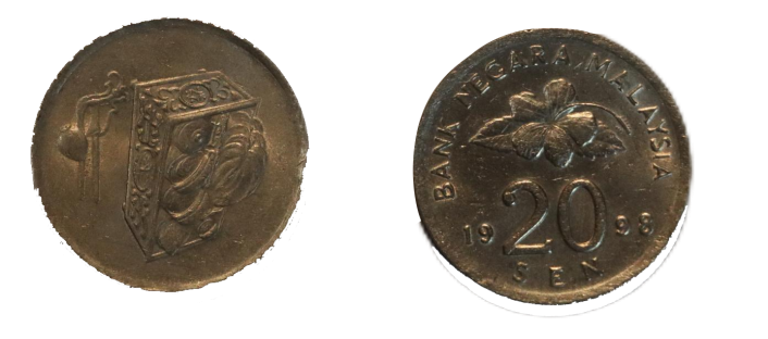 1令吉硬币上呈现的是马来短剑,也被称为克力士剑。克力士剑是与大马士革钢刀、日本武士刀齐名的世界三大名刃之一。克力士剑兴盛于13世纪的伯夷王国,刃面由糙面陨铁焊接花纹刃制成,制造极为精细,锤锻入火需500次左右,刃上的夹层钢有600层之多。因锻造时加入陨铁或用纯陨铁打造,克力士剑的花纹呈现粗犷的质地,石纹与叶脉纹是其一大特色。在马来文化中,克力士剑被视为具有神秘力量的圣物,铸剑师也会得到优崇的待遇,被尊为国师,俸养终身,赐给土地,并可世袭接受俸禄。